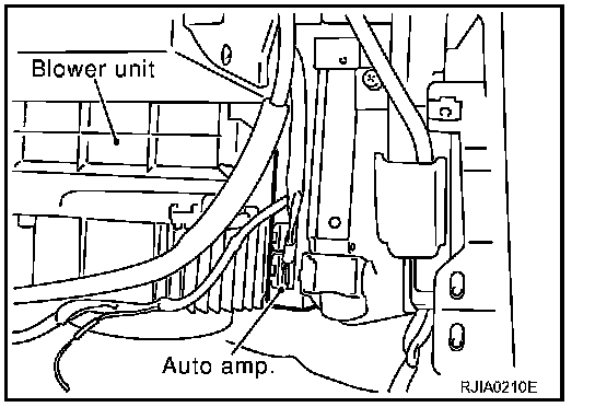 The auto amplifier has a built-in microcomputer which processes information sent from various sensors needed for air conditioner operation. The air mix door motor, mode door motor, intake door motor, blower motor and compressor are then controlled. The auto amplifier is unitized with control mechanisms. When the various switches and temperature adjustment dial are operated, data is input to the auto amp. from the AV control unit or AV and NAVI control unit using multiplex communication.