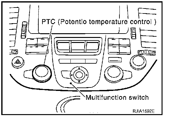 The PTC is built into the multifunction switch. It can be set at an interval of 0.5 °C (1.0 °F) in the 18 °C (60 °F) to 32 °C (90 °F) temperature range by turning the temperature dial. The set temperature is displayed.
