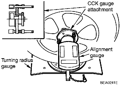 Before inspection, mount front wheels onto turning radius gauge. Mount rear wheels onto a stand that has same height so vehicle will remain horizontal.