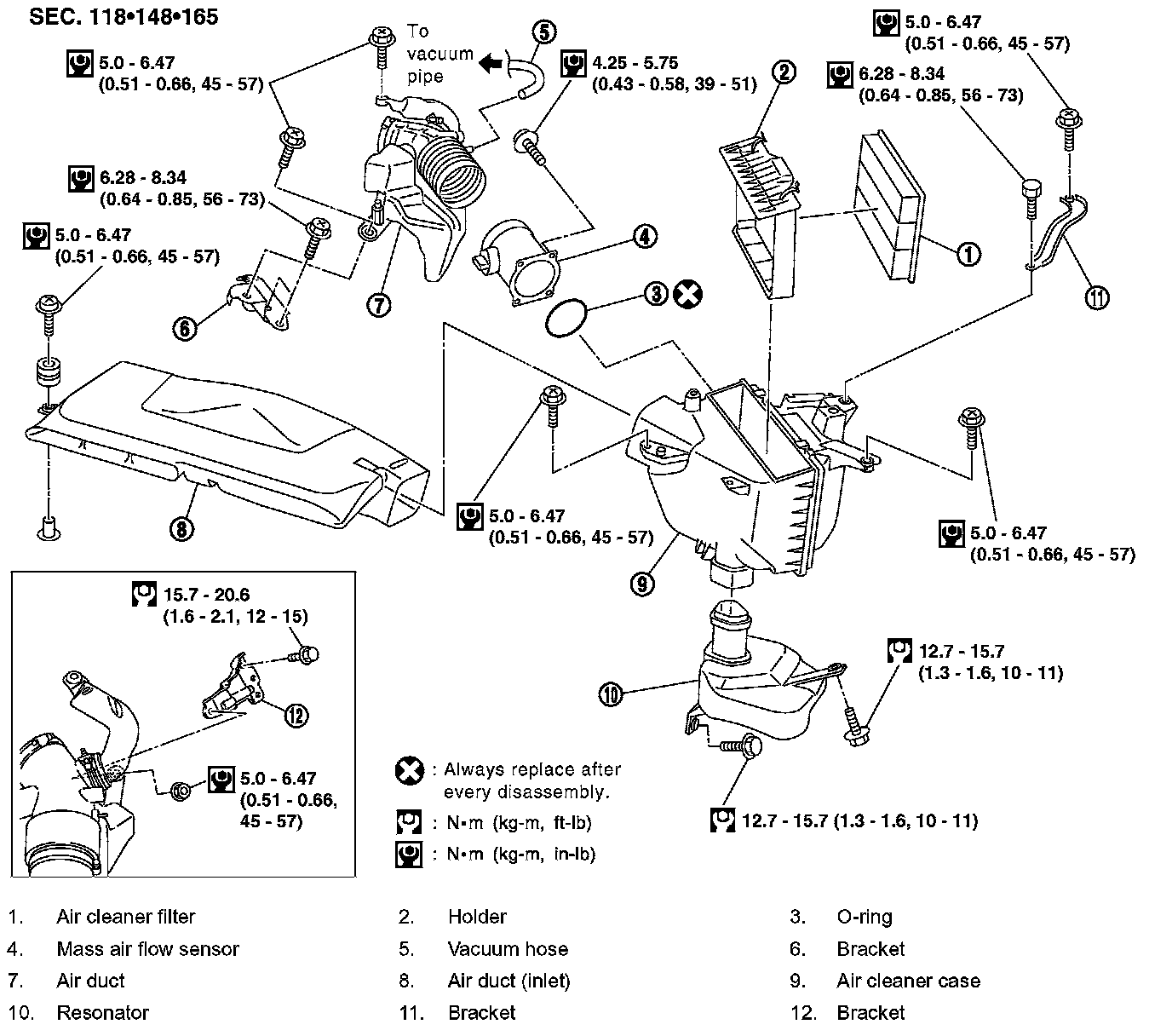 3. Remove air duct (inlet), air cleaner case/mass air flow sensor assembly and air duct/resonator assembly disconnecting their joints.