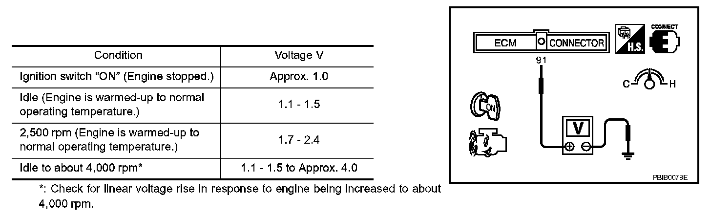 3. Check voltage between ECM terminal 91 (Mass air flow sensor signal) and ground.