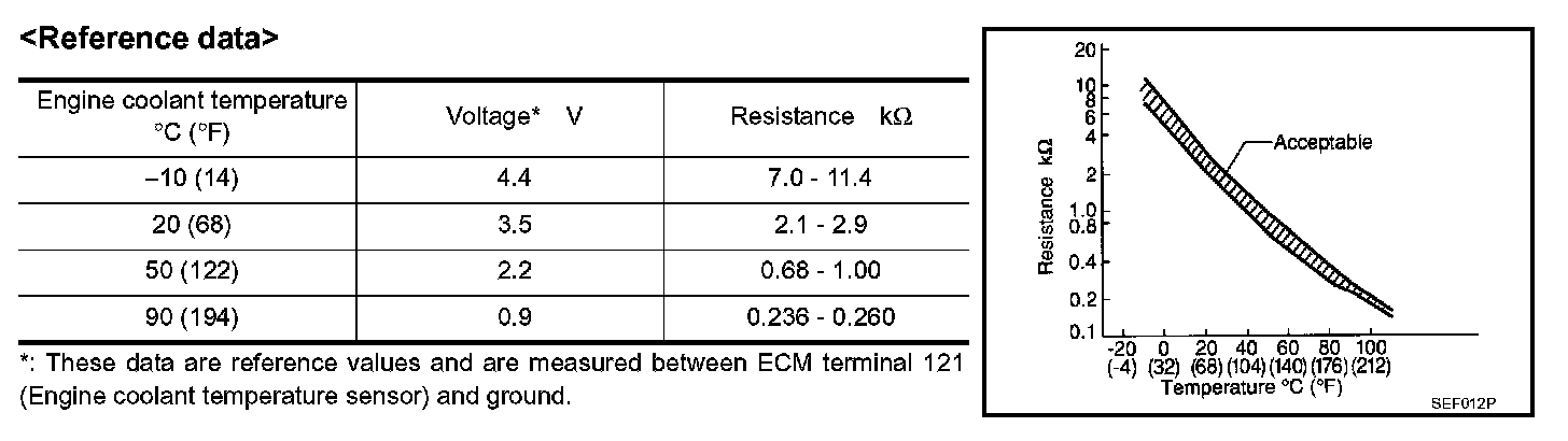 The engine coolant temperature sensor is used to detect the engine coolant temperature. The sensor modifies a voltage signal from the ECM. The modified signal returns to the ECM as the engine coolant temperature input. The sensor uses a thermistor which is sensitive to the change in temperature. The electrical resistance of the thermistor decreases as temperature increases.