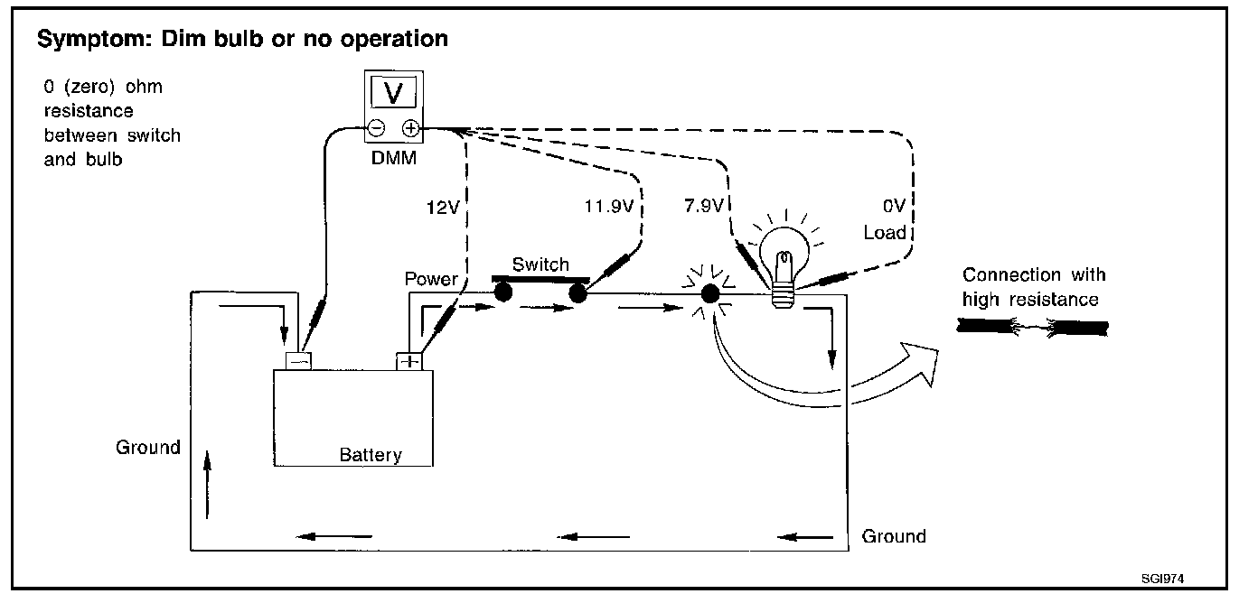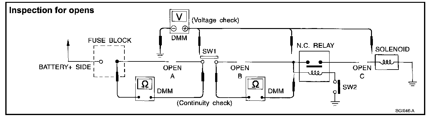 - Connect the other probe to the fuse block (power) side of SW1. Little or no resistance will indicate that portion of the circuit has good continuity. If there were an open in the circuit, the DMM would indicate an over limit or infinite resistance condition. (point A)