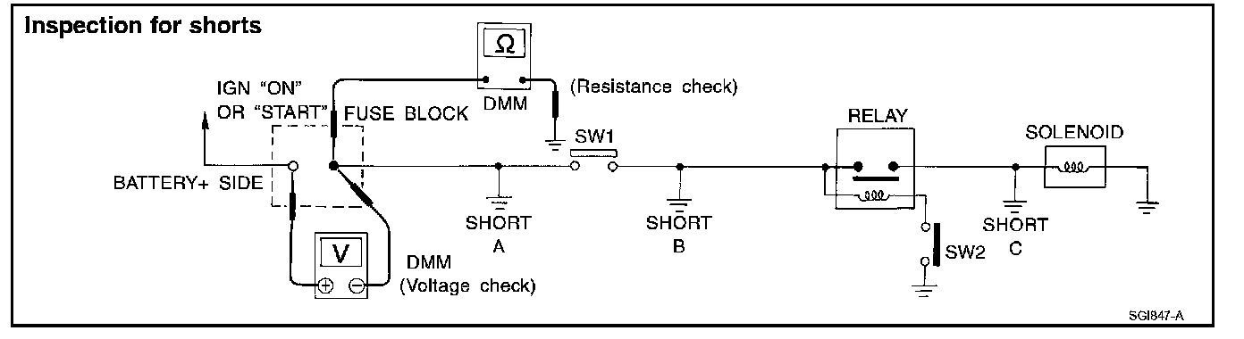 - With SW1 open and the DMM leads across both fuse terminals, check for voltage. voltage; short is between fuse block and SW1 (point A).