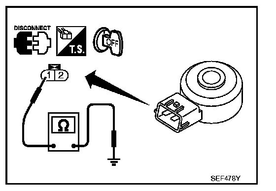 Check resistance between knock sensor terminal 1 and ground.