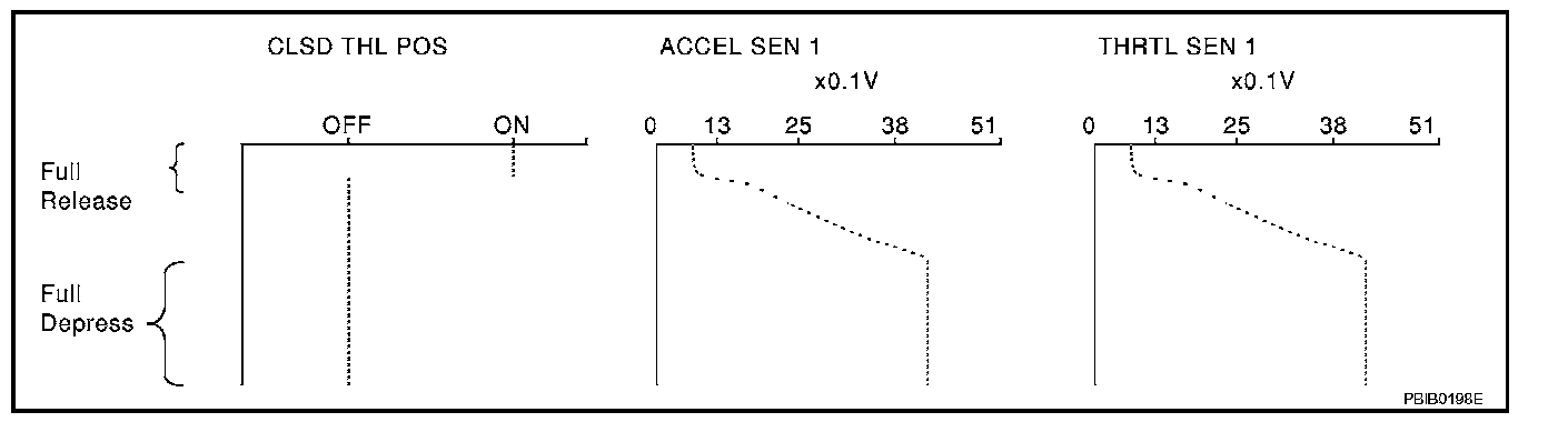Below is the data for "CLSD THL POS", "ACCEL SEN 1" and "THRTL SEN 1" when depressing the accelerator pedal with the ignition switch "ON" and with selector lever in "D" position.