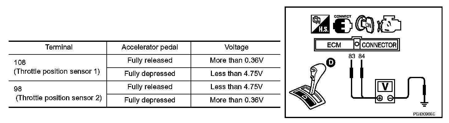 6. Check voltage between ECM terminals 108 (TP sensor 1signal), 98 (TP sensor 2signal) and engine ground under the given conditions.
