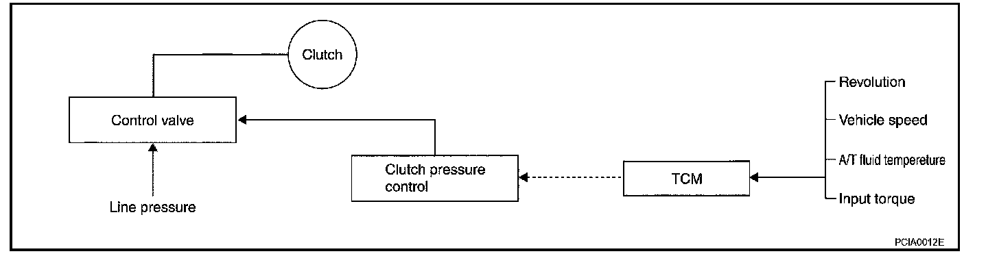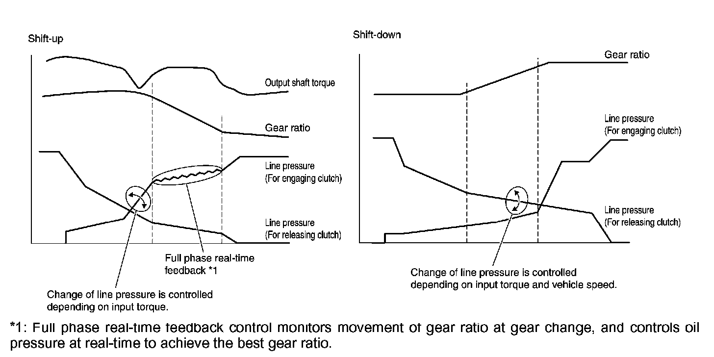 Shift ControlThe clutch pressure control solenoid is controlled by the signals from the switches and sensors. Thus, the clutch pressure is adjusted to be appropriate to the engine load state and vehicle driving state. It becomes possible to finely control the clutch hydraulic pressure with high precision and a smoother shift change characteristic is attained.
