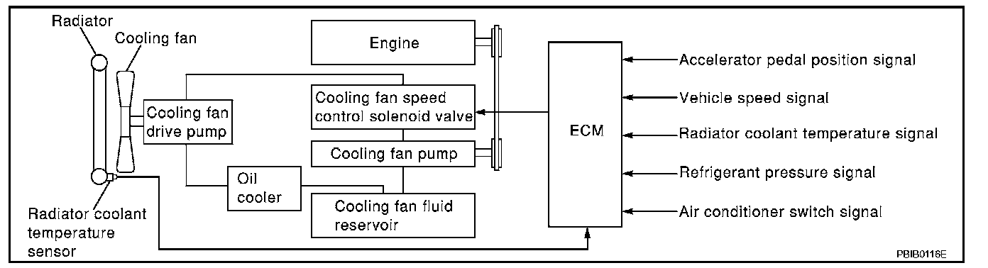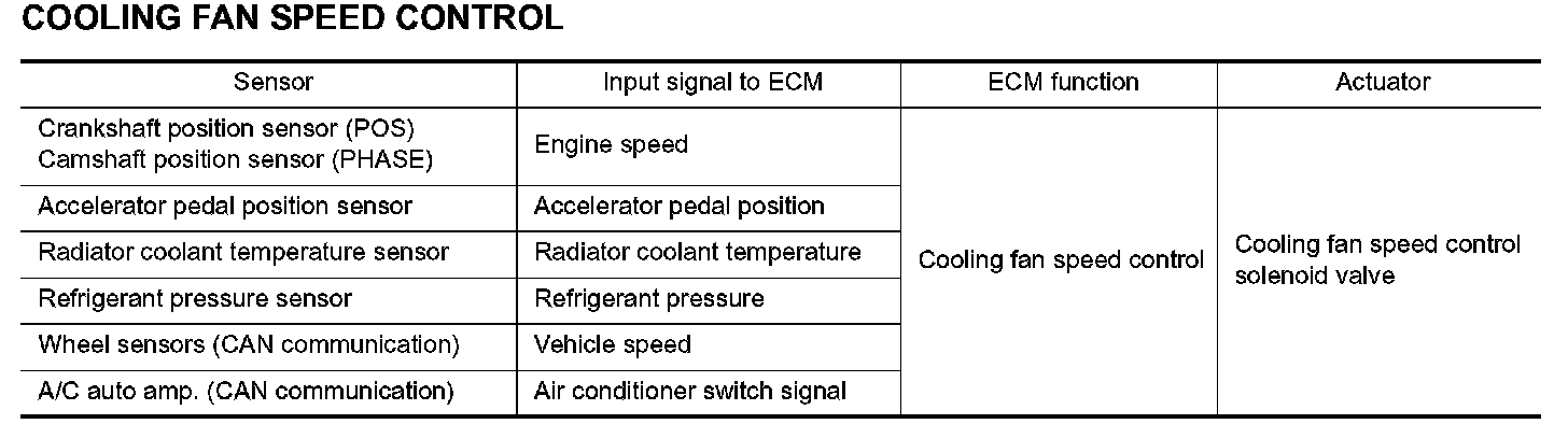The ECM controls the cooling fan speed corresponding to the engine speed, the radiator coolant temperature, refrigerant pressure, vehicle speed, air conditioner switch signal, etc.