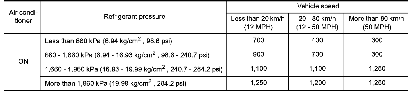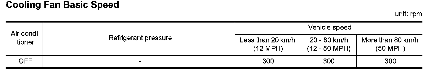 The ECM determines the target fan speed based on the basic fan speed considering the radiator coolant temperature and the engine speed. The ECM controls fan speed between 0 to 2,550 rpm.