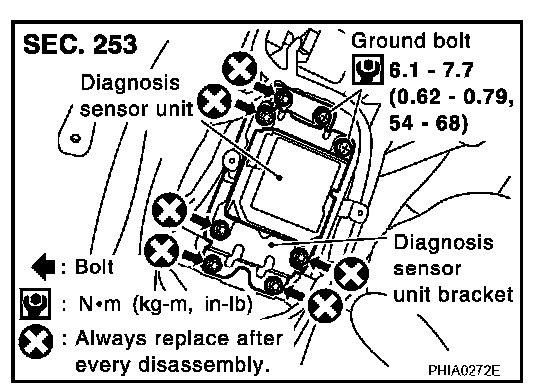 - After replacement of diagnosis sensor unit, perform self-diagnosis to check that no malfunction is detected. Refer to SRS-20, "SRS Operation Check". Diagnostic Procedures