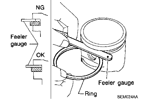 ^ Measure side clearance of piston ring and piston ring groove with feeler gauge.
