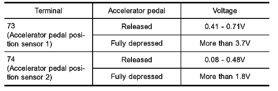 3. Check voltage between ECM terminals 73 (APP sensor 1 signal), 74 (APP sensor 2 signal) and engine ground under the given conditions.