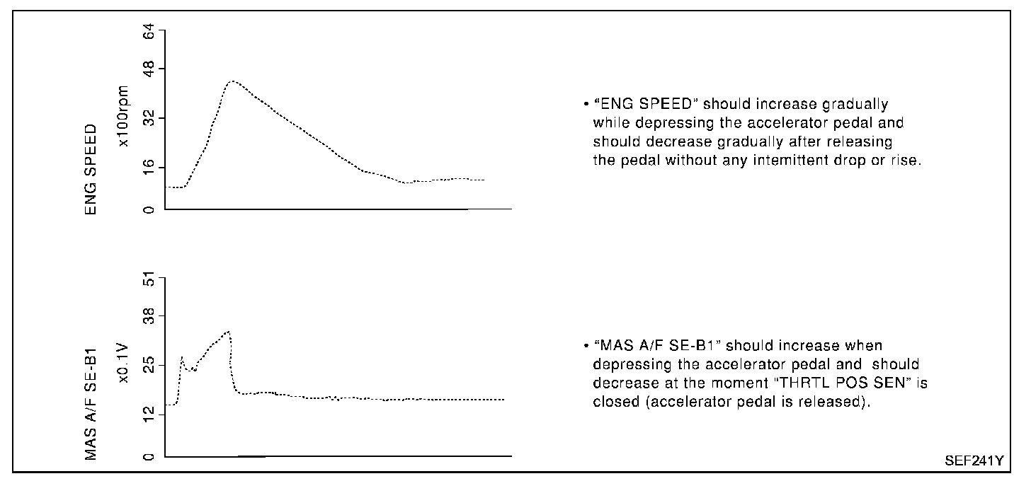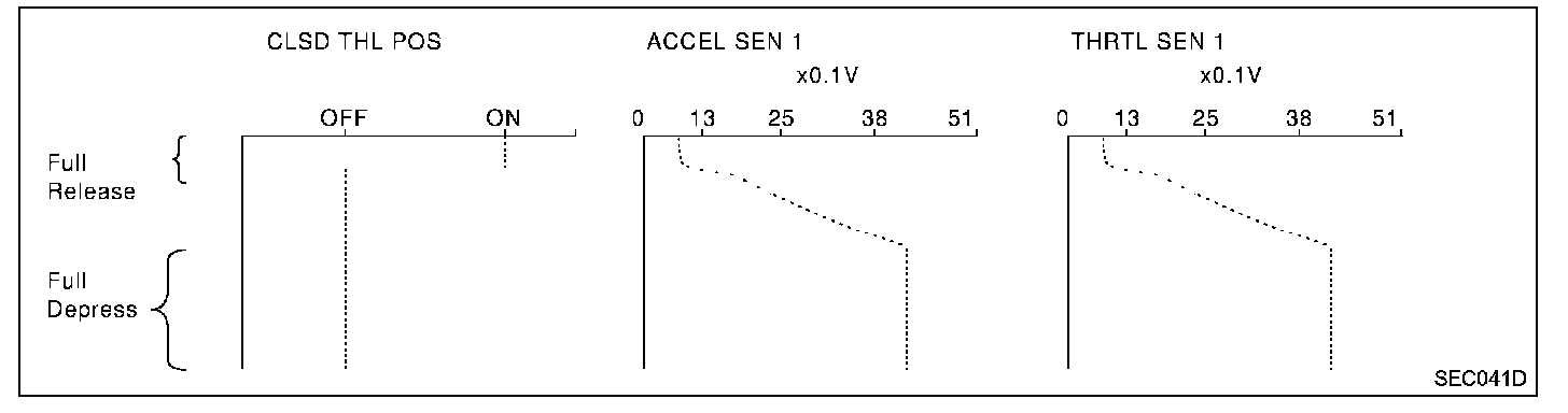 Below is the data for "CLSD THL POS", "ACCEL SEN1" and "THRTL SEN1" when depressing the accelerator pedal with the ignition switch "ON" and with selector lever in "D" position (AT models).