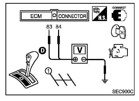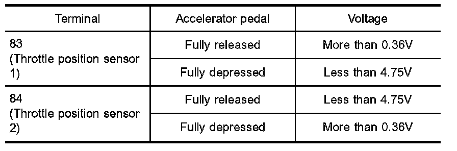 5. Check voltage between ECM terminals 83 (TP sensor 1), 84 (TP sensor 2) and engine ground under the given conditions.