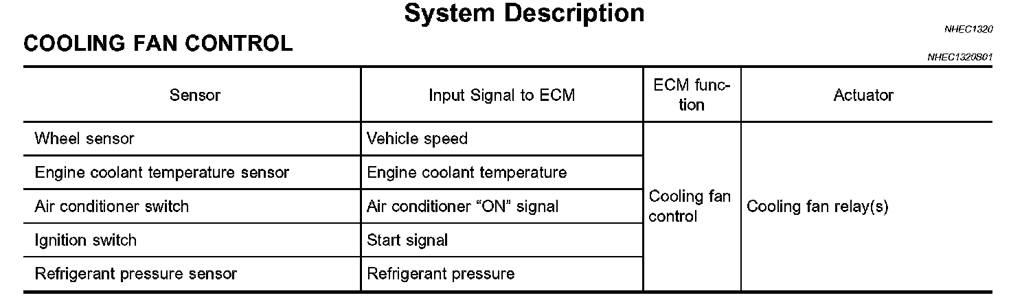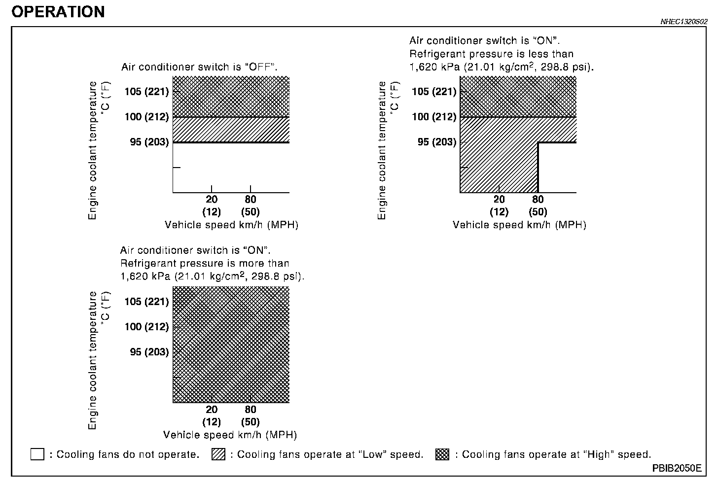 The ECM controls the cooling fan corresponding to the vehicle speed, engine coolant temperature, refrigerant pressure and air conditioner ON signal. The control system has 3-step control [HIGH/LOW/OFF].