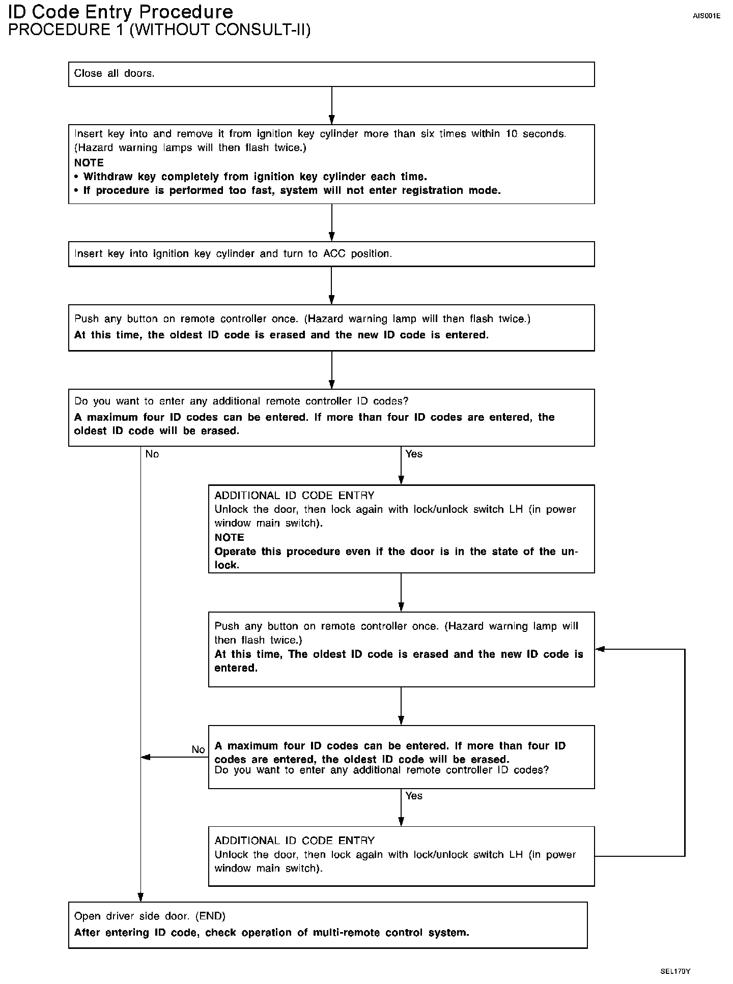 NOTE: If a electronic key is lost, the ID code of the lost electronic key must be erased to prevent unauthorized use. When the ID code of a lost electronic key is not known, all controller ID codes should be erased. After all ID codes are erased, the ID codes of all remaining and/or new remote controllers must be re-registered.