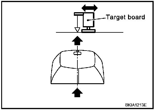 3. Adjust the position of the target board so that the extended line that links the center of the rear wind shield (the center of the rear defogger pattern) and the center of the front wind shield (the setting part of the room mirror) align with the weight suspended from the board.