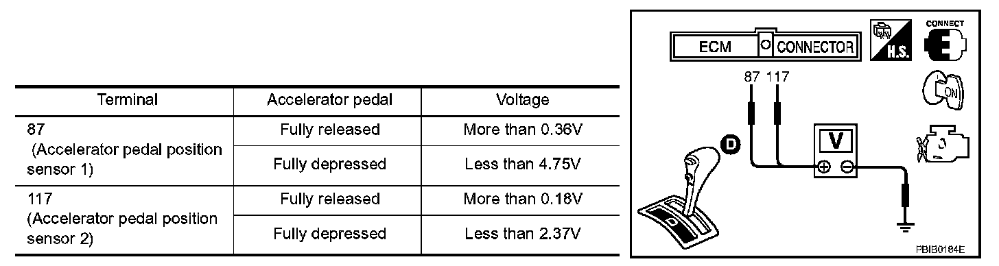 3. Check voltage between ECM terminals 87 (APP sensor 1 signal), 117 (APP sensor 2 signal) and ground under the given conditions.
