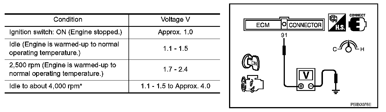 3. Check voltage between ECM terminal 91 (Mass air flow sensor signal) and ground.