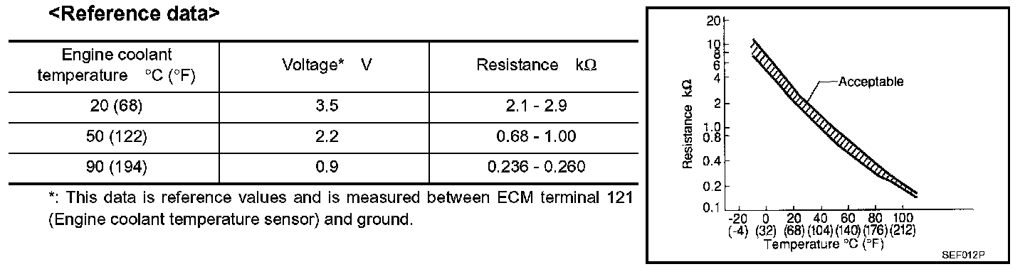 1. Check resistance between engine coolant temperature sensor terminals 1 and 2 as shown in the figure.