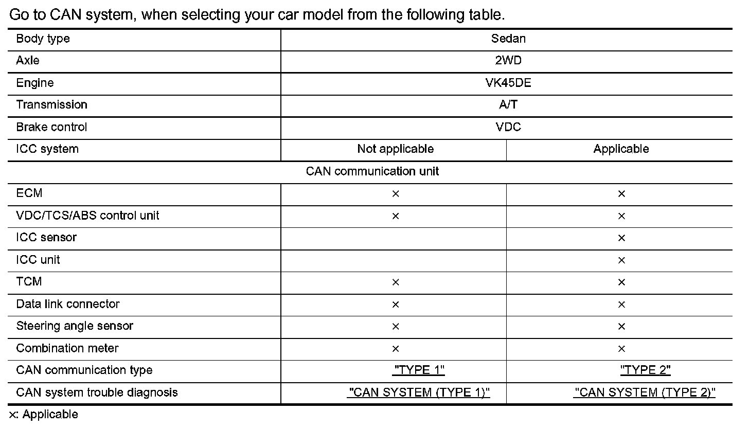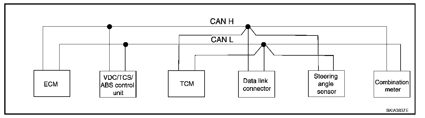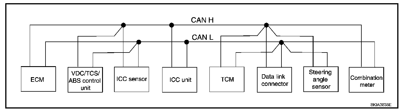 System DescriptionCAN (Controller Area Network) is a serial communication line for real time application. It is an on-vehicle multiplex communication line with high data communication speed and excellent error detection ability. Many electronic control units are equipped onto a vehicle, and each control unit shares information and links with other control units during operation (not independent). In CAN communication, control units are connected with 2 communication lines (CAN H line, CAN L line) allowing a high rate of information transmission with less wiring. Each control unit transmits/receives data but selectively reads required data only.
