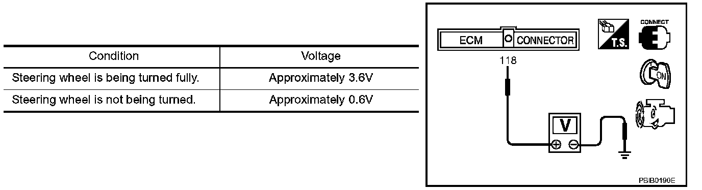 3. Check voltage between ECM terminal 118 and ground under the given conditions.