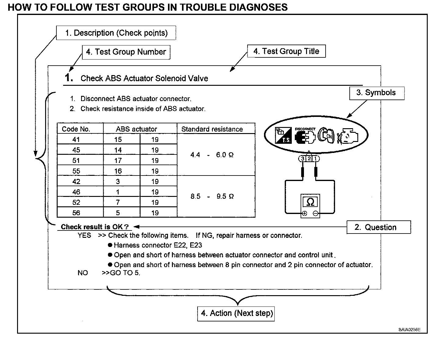 Next action for each test group is indicated based on result of each question. Test group number is shown in the left upper portion of each test group.