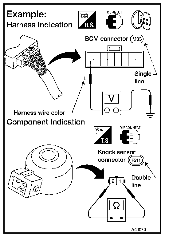 If you need to check circuit continuity between harness connectors in more detail, such as when a sub-harness is used, refer to Wiring Diagram in each individual section and Harness Layout in Power Supply, Ground & Circuit Elements for identification of harness connectors.