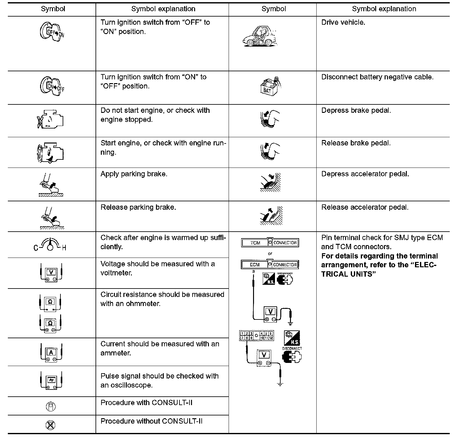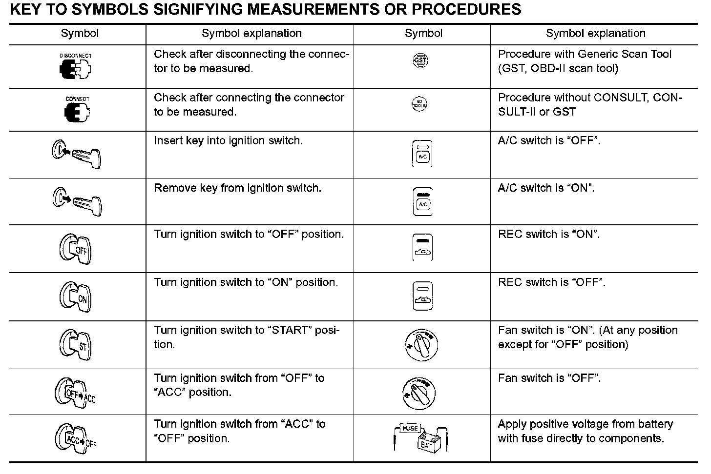 Symbols included in illustrations refer to measurements or procedures. Before diagnosing a problem, familiarize yourself with each symbol. Refer to "Connector Symbols" in General Information and "KEY TO SYMBOLS SIGNIFYING MEASUREMENTS OR PROCEDURES" below.