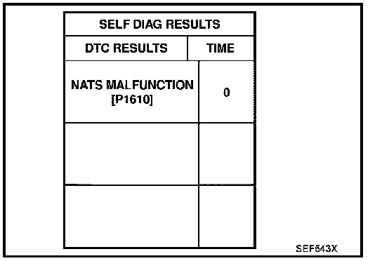 IVIS (Infiniti Vehicle Immobilizer System - NATS)- If the security indicator lights up with the ignition switch in the ON position or "NATS MALFUNCTION" is displayed on "SELF-DIAG RESULTS" screen, perform self-diagnostic results mode with CONSULT-II using NATS program card. Refer to BL-172, "IVIS (INFINITI VEHICLE IMMOBILIZER SYSTEM-NATS)". Infiniti Vehicle Immobilizer System (IVIS ) - NATS