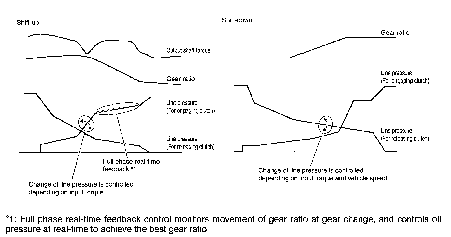 Shift ControlThe clutch pressure control solenoid is controlled by the signals from the switches and sensors. Thus, the clutch pressure is adjusted to be appropriate to the engine load state and vehicle driving state. It becomes possible to finely control the clutch hydraulic pressure with high precision and a smoother shift change characteristic is attained.