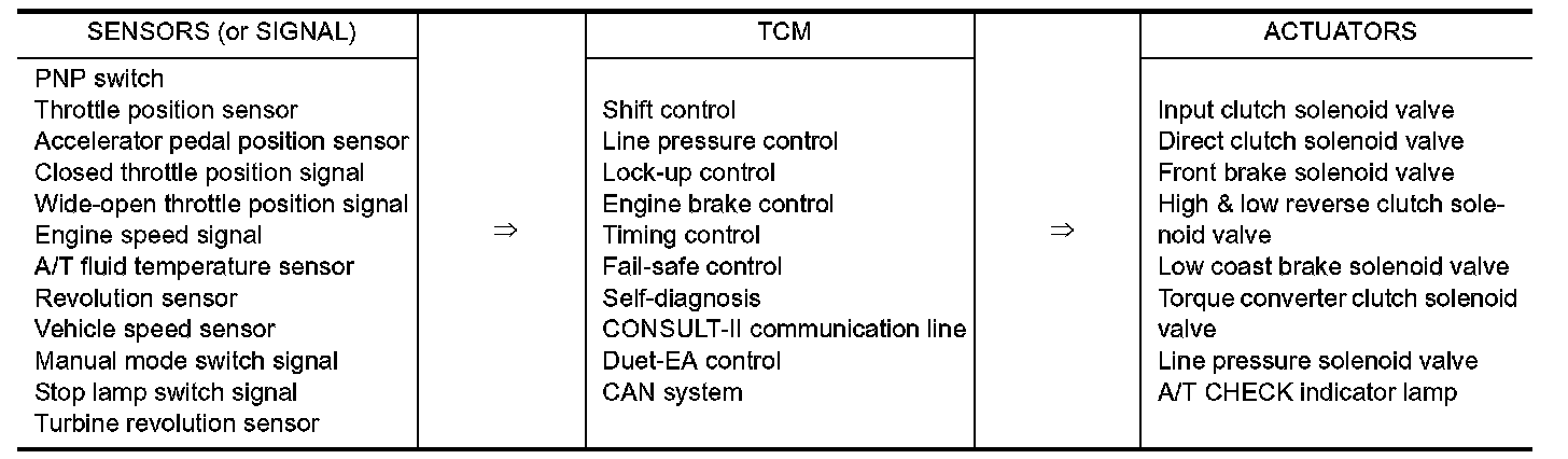 The automatic transmission senses vehicle operating conditions through various sensors or signals. It always controls the optimum shift position and reduces shifting and lock-up shocks.