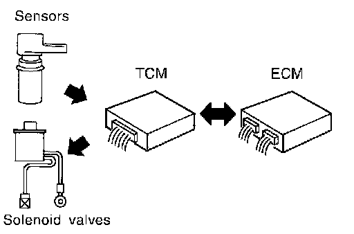 The TCM also communicates with the ECM by means of a signal sent from sensing elements used with the OBD-related parts of the A/T system for malfunction-diagnostic purposes. The TCM is capable of diagnosing malfunctioning parts while the ECM can store malfunctions in its memory.