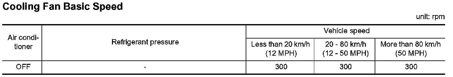 The ECM determines the target fan speed based on the basic fan speed considering the radiator coolant temperature and the engine speed. The ECM controls fan speed between 0 to 2,550 rpm.