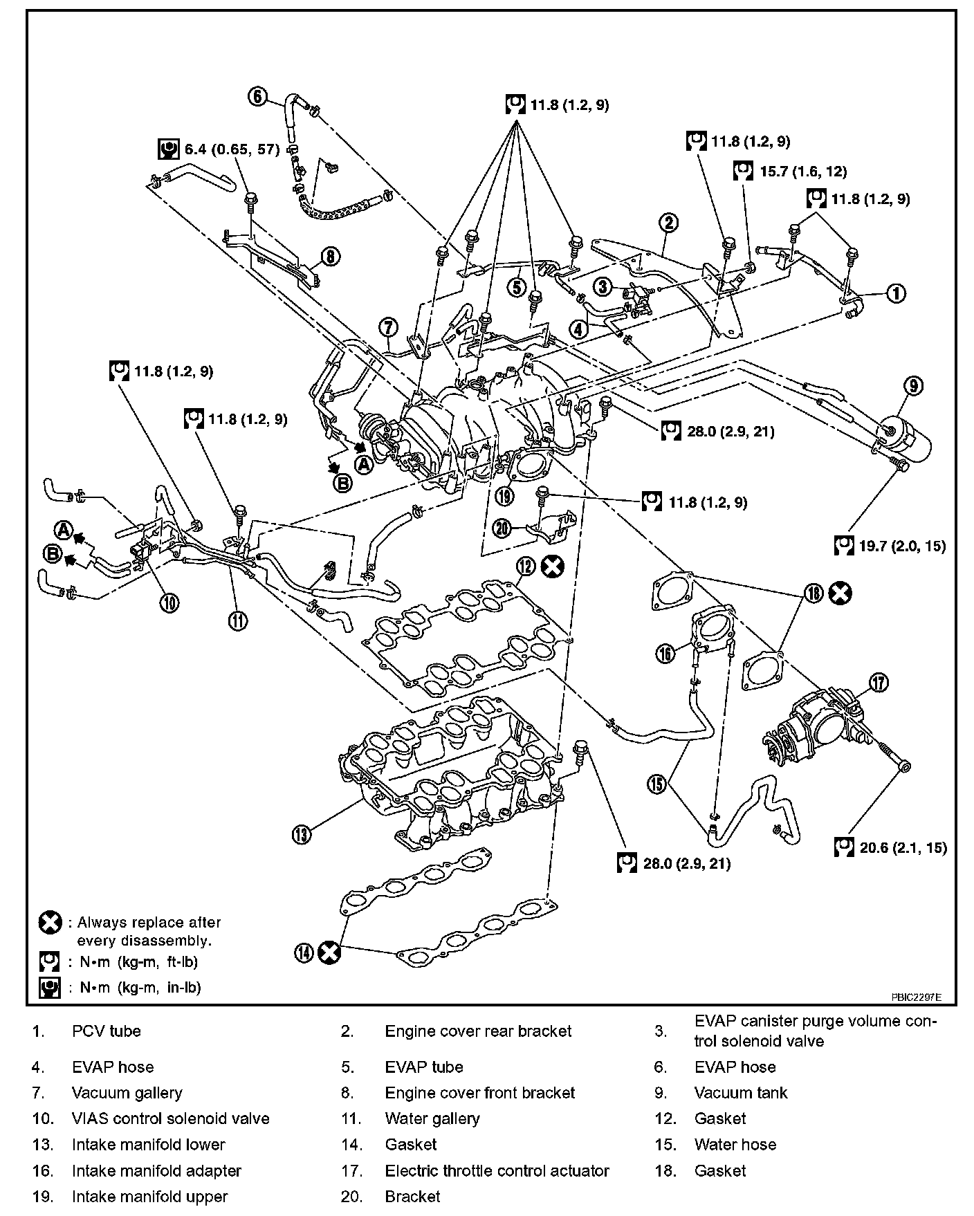 Intake manifold upper 24.5 - 31.4 Nm (2.5 - 3.2 kg-m, 18 - 23 ft. lbs.)
