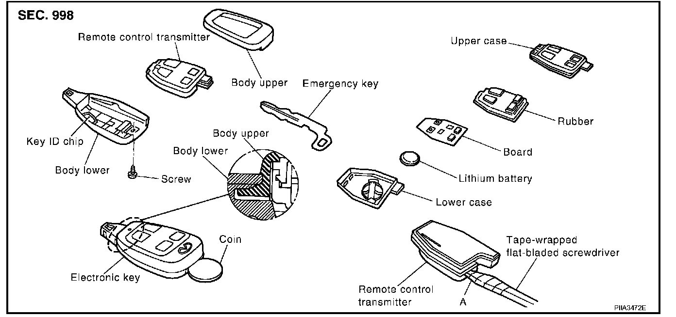 2. Insert a slotted screwdriver wrapped with tape into the electronic key transmitter (A) and twist the screwdriver to disassemble the transmitter.
