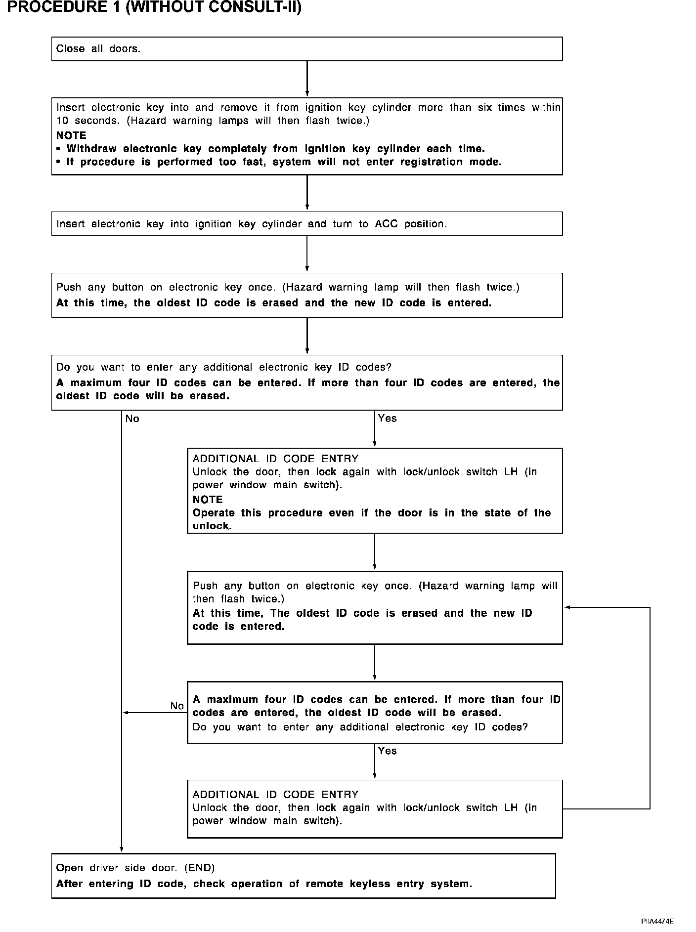 - When registering an additional electronic key, the existing ID codes in memory may or may not be erased. If four ID codes are stored in memory, when an additional code is registered, only the oldest code is erased. If less than four ID codes are stored in memory, when an additional ID code is registered, the new ID code is added and no ID codes are erased.