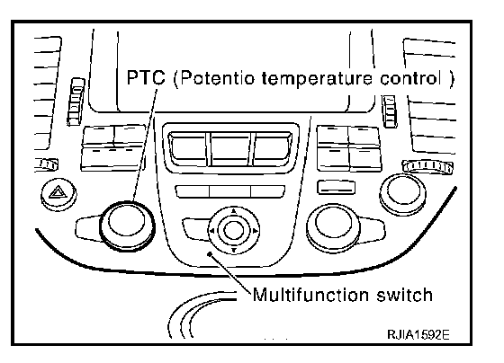 The PTC is built into the multifunction switch. It can be set at an interval of 0.5 °C (1.0 °F) in the 18 °C (60 °F) to 32 °C (90 °F) temperature range by turning the temperature dial. The set temperature is displayed.