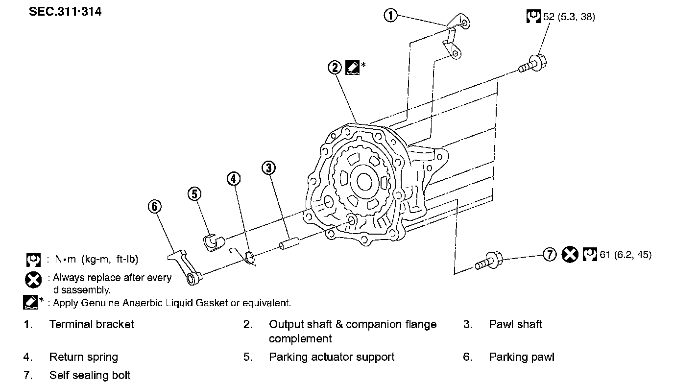 Output shaft & companion flange complement mounting bolt: 52 Nm (5.3 kg-m, 38 ft. lbs.)