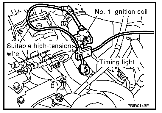 2. Connect No. 1 ignition coil and No. 1 spark plug with suitable high-tension wire as shown, and attach timing light clamp to this wire.