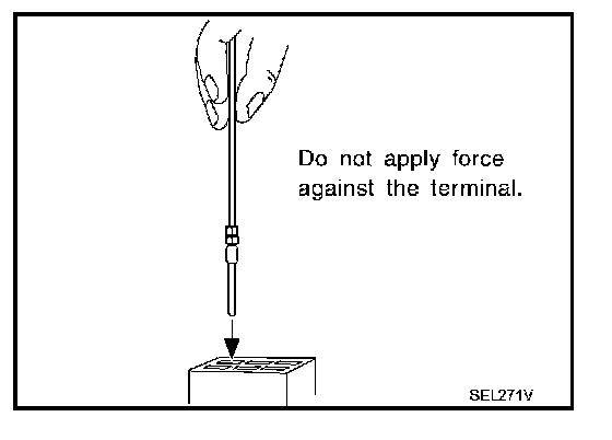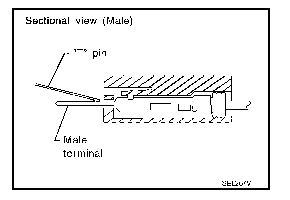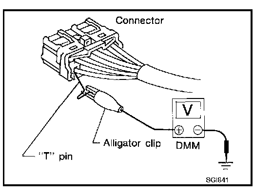 The probe of a digital multimeter (DMM) may not correctly fit the connector cavity. To correctly probe the connector, follow the procedures below using a "T" pin. For the best contact grasp the "T" pin using an alligator clip.