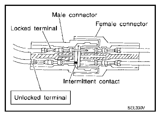 If the intermittent open circuit occurs, follow the procedure below to inspect for open wires and enlarged contact spring of female terminal.