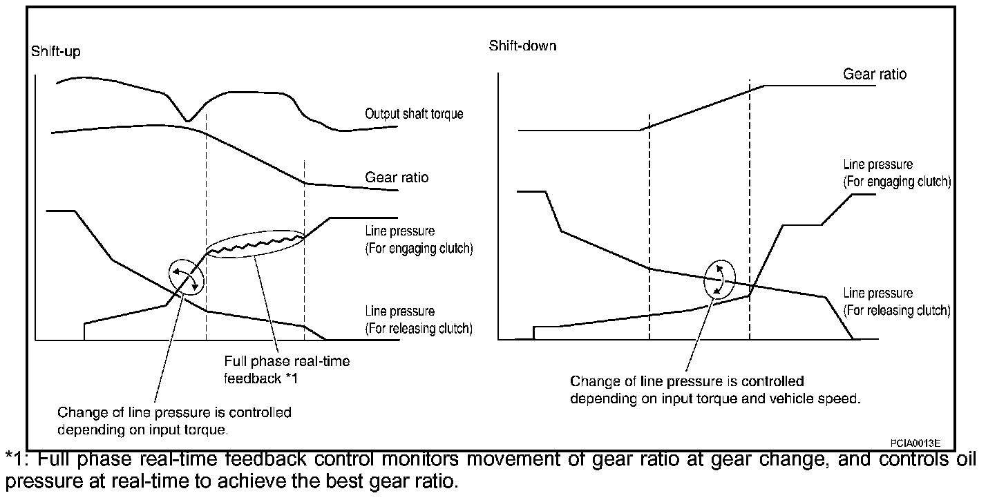 Shift ControlThe clutch pressure control solenoid is controlled by the signals from the switches and sensors. Thus, the clutch pressure is adjusted to be appropriate to the engine load state and vehicle driving state. It becomes possible to finely control the clutch hydraulic pressure with high precision and a smoother shift change characteristic is attained.