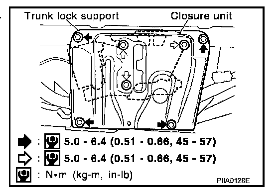 1. Remove trunk rear finisher. Refer to "Removal and Installation of Trunk Closure Control Unit".