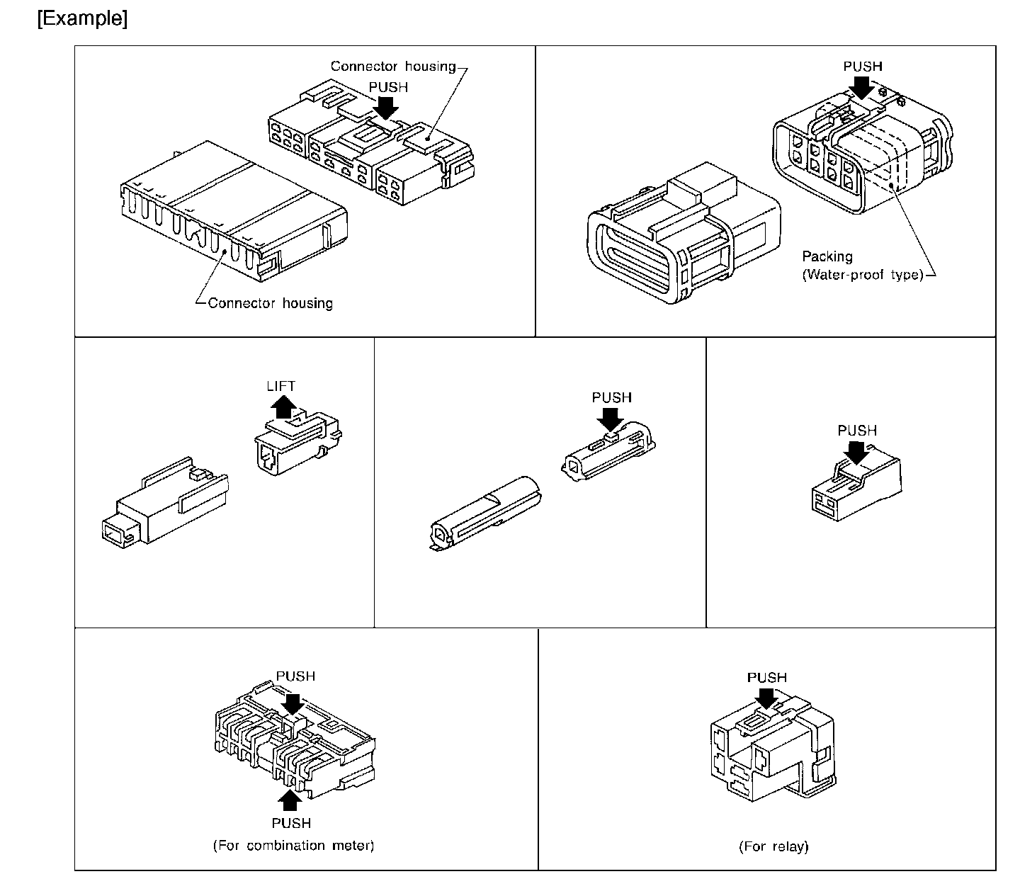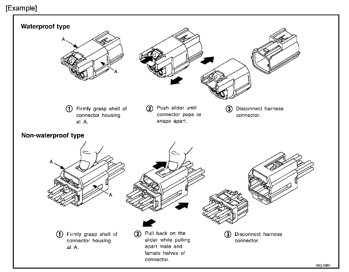 - Do not pull the harness or wires when disconnecting the connector.