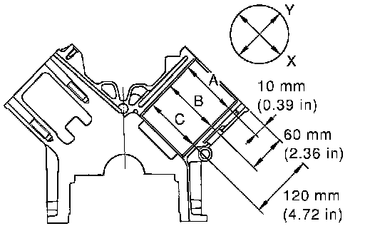 ^ Using a bore gauge, measure the cylinder bore diameter for wear, out-of-round and taper at 6 different points on each cylinder. (X and Y directions at A, B and C)