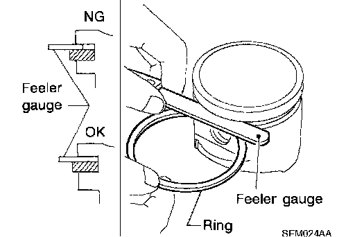 ^ Measure the side clearance of piston ring and piston ring groove with feeler gauge.