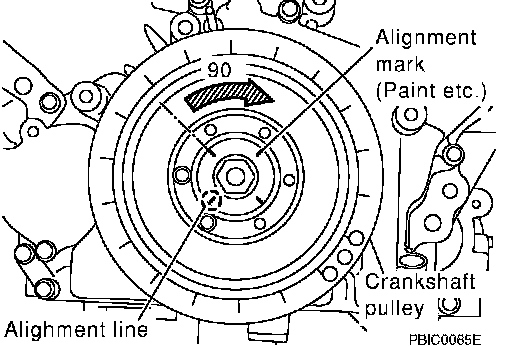 Select one most visible notch of the four on bolt flange. Corresponding to the selected notch, put a mating mark (such as paint) on crankshaft pulley.