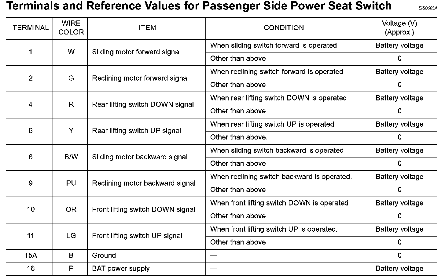 Terminals And Reference Values For Passenger Side Power Seat Switch: